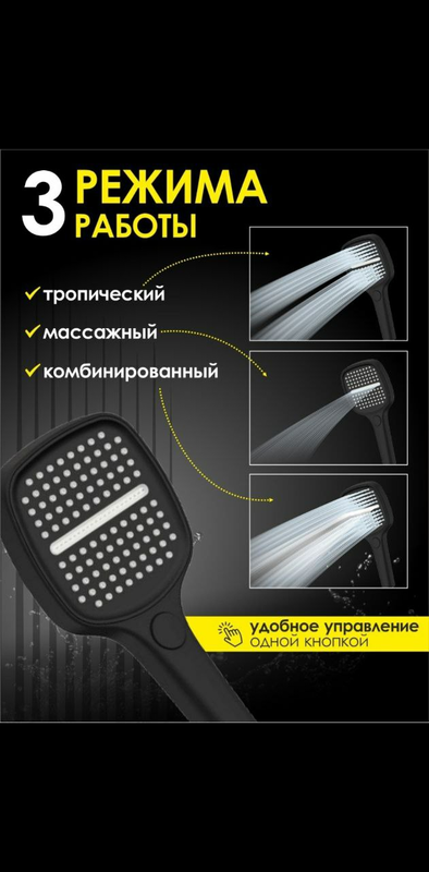 Лейка оснащена тремя функциональными режимами струи, переключение между которыми осуществляется удобной кнопкой. Это позволяет быстро и комфортно изменять тип потока воды: от мягкого распыления до интенсивного массажа.