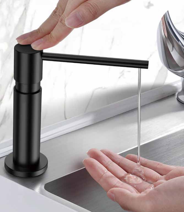 Высота дозатора от столешницы составляет 14 см — оптимальный размер для удобного захвата и нажатия, что особенно важно при частом использовании. Такая высота позволяет легко управлять дозировкой, не создавая дискомфорта в работе на кухне и экономя пространство.